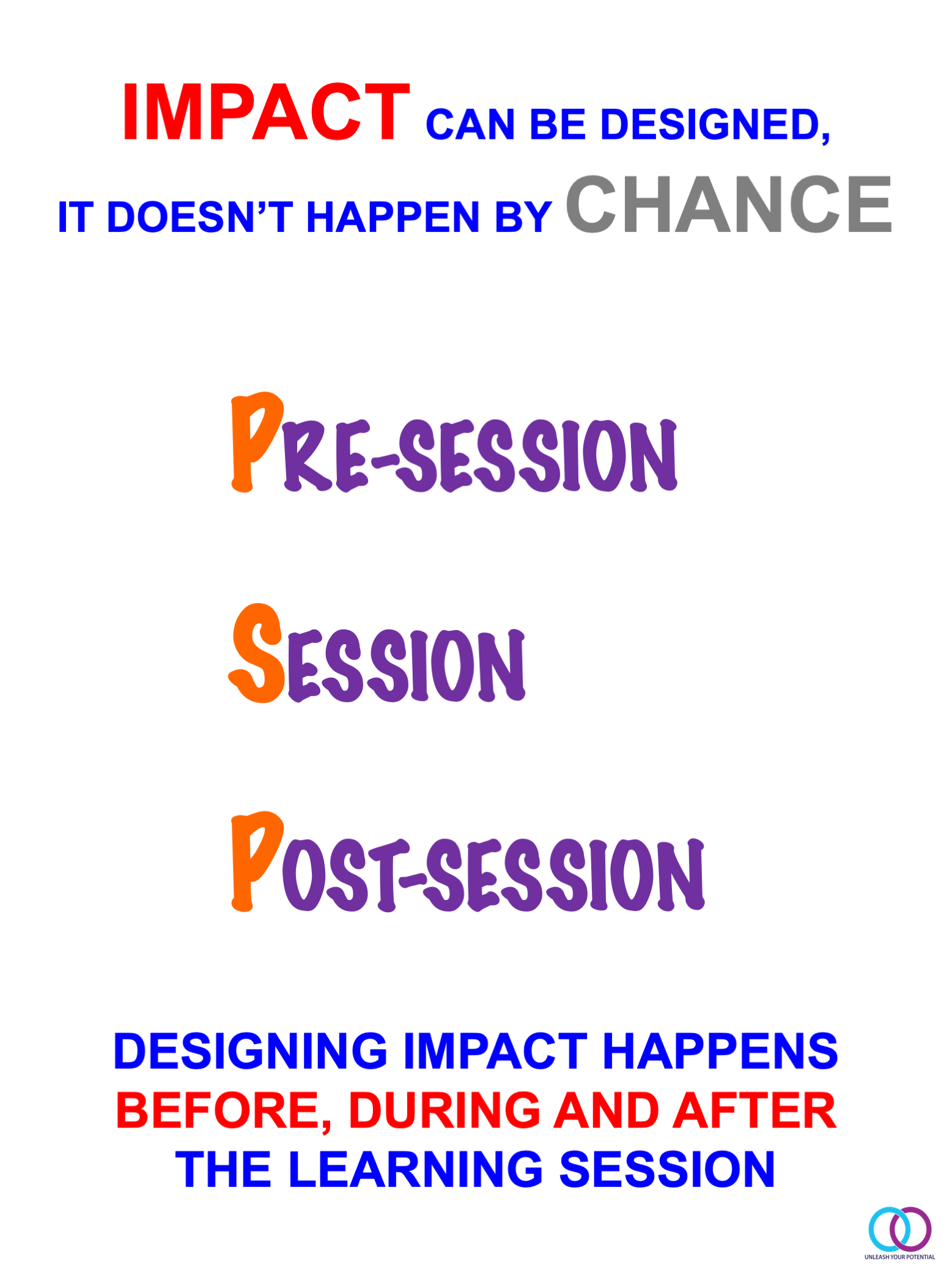 We are all aware, designing involves not only the session but also the pre and post session. In some circumstance, these two phases can be even more important than the learning session itself. There have been instances that the failure of designing a Pre-session has been the downfall of a learning session. The same is true where there have been instances the success of a learning session is credited to the initiatives that was design for after the learning session.