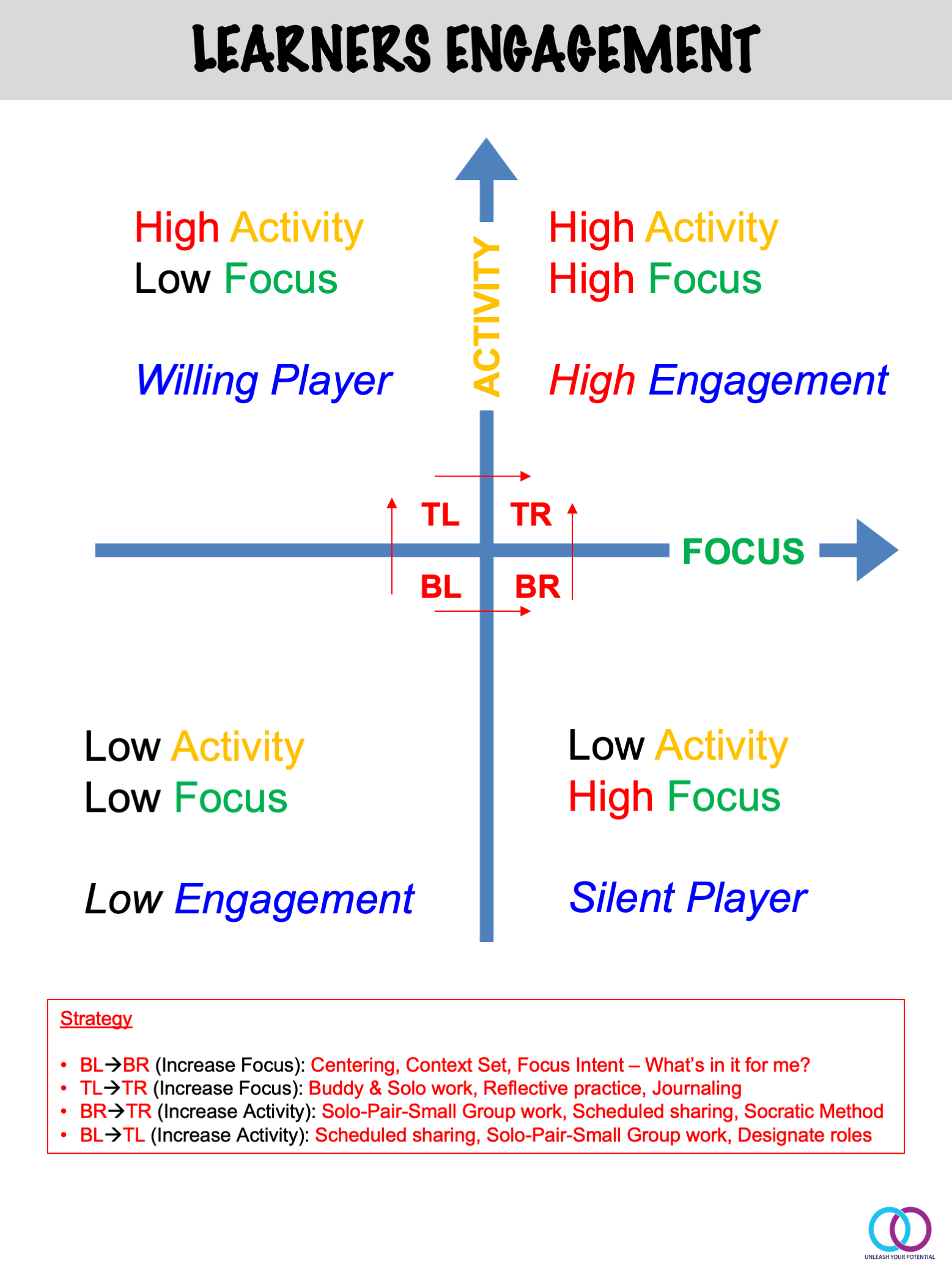 Now that we know some of the circumstance that makes a person be in one of the quadrants, we can now design processes and activities to move them from the quadrant with low engagement (BL)  & low focus on learning (TL) to the quadrants with high engagement (TR and BR). Ultimately, moving them into the most optimum quadrant in terms of engagement and learning; the top right (TR) quadrant.