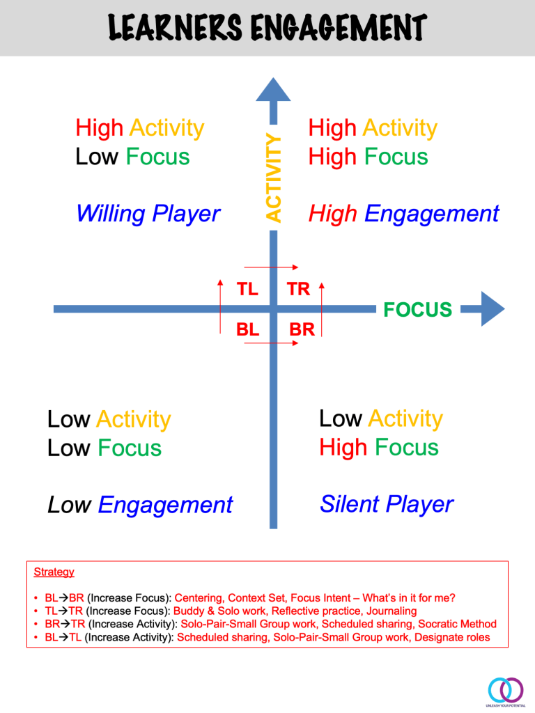 We, as learners, also start a trainings from one of these quadrant. There were days or trainings that we come in as a willing player. Other times we come in as a silent player. We sometimes start a training with low engagement and at time with high engagement.