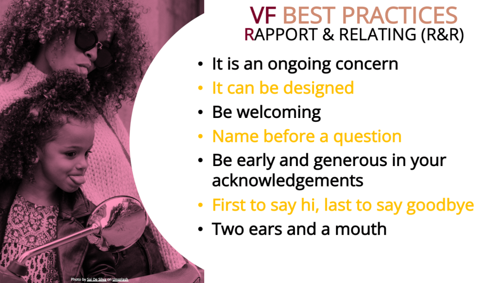 Since it is important to build and nurture rapport, it is therefore important for us to be deliberate about it in our engagement sessions. This can be done by building various activities, touchpoints, engagement opportunities etc. into our session design. Be deliberate in your design. Pepper rapport building and nurturing moments throughout your engagement sessions.